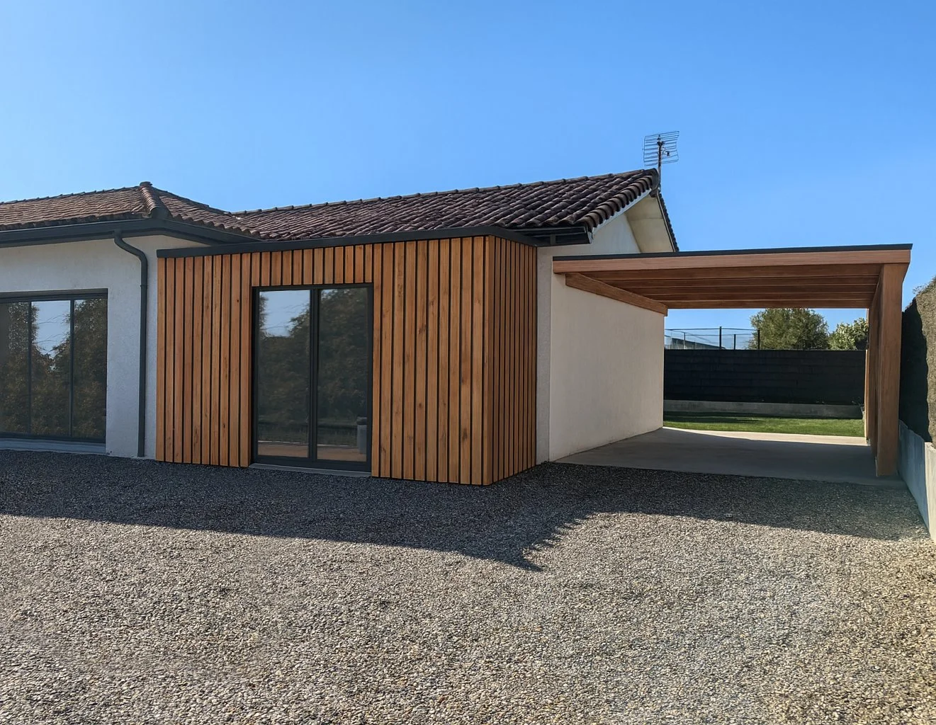 Cette extension en ossature bois, située à Menville dans la région toulousaine, a été pensée pour agrandir la maison tout en affirmant une écriture architecturale contemporaine.