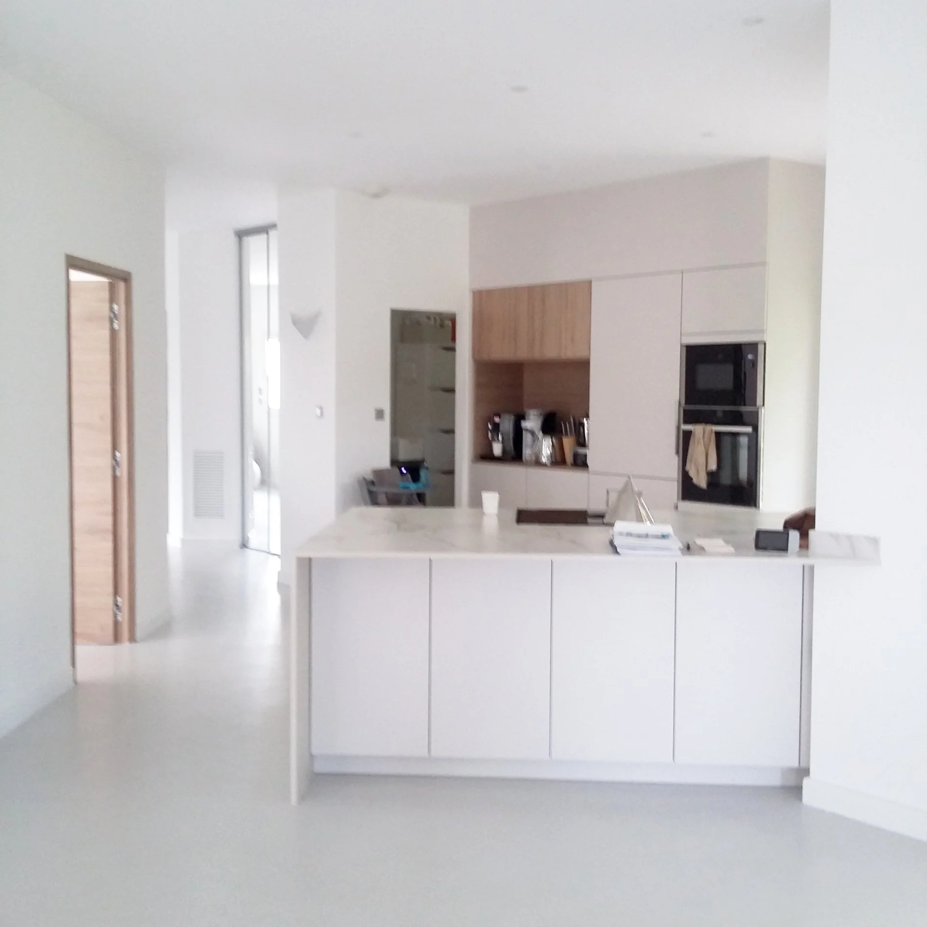 Nous avons repensé intégralement l’agencement intérieur en ouvrant les anciennes cloisons afin de créer une grande pièce à vivre ouverte, baignée de lumière naturelle. La nouvelle disposition met en valeur la cuisine ouverte, le coin salon et l’espace repas, qui dialoguent désormais dans un esprit minimaliste et épuré.